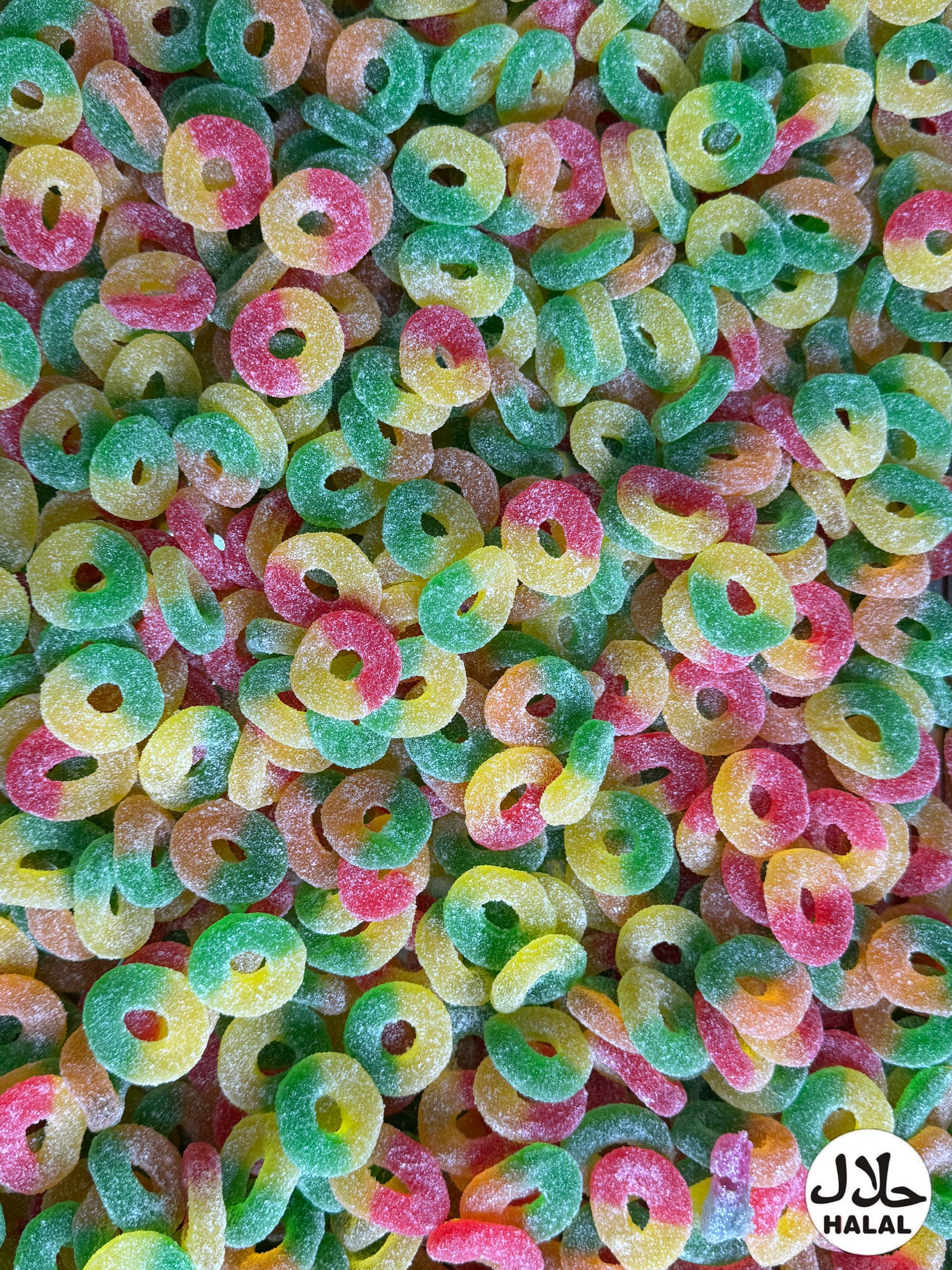 Glukosesirup, Zucker, Rindergelatine, Frucht- und Pflanzenkonzentrate (Erdbeere, Zitrone,Apfel,Pfirsich,Orange, Exotische Früchte,Bananen, Ananas), Säuerungsmittel (Citronensäure),Speißestärke, pflanzliches Öl (Palm), Aroma, Lebensmittelfarbe (gelb, orange, grün, blau, rot), Überzugsmittel (Carnaubawachs, Bienenwachs weiß und gelb), Farbstoffe. Kann Spuren von Milch, Soja und Gluten enthalten